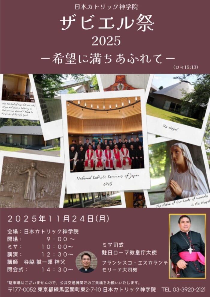 11月24日(月・祝)に日本カトリック神学院のザビエル祭が予定されています。藤が丘教会からマイクロバスを出しますので、お子さまを含め奮ってご参加ください。現地での座席確保のため早めの出発を考えていますので、その点ご理解賜れますと幸いです。